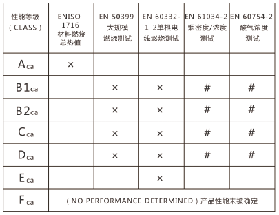EN50575标准根据电线电缆热释放量、燃烧破坏长度等将电缆的防火等纺划分为七个等级;分别为:Aca,B1ca,B2ca,Cca,Dca,Eca,Fca这七个等级。根据不同的防火等级,选取对应的认证模式,Aca,B1ca,B2ca、Cca等级属于CPR 1+类,Dca,Eca等级属于CPR 3类,Fca等级属于CPR具体的线缆等级和测试项目及要求如下图所示:线缆等级和测试项目及要求