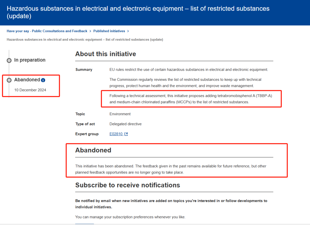 2024年12月10日,欧盟发布关于RoHS指令拟增加四溴双酚A(TBBP-A)和中链氯化石蜡(MCCPs)提案的最近进展,该提案倡议被正式终止,标志着这两种物质的最新限制措施并未按计划执行。