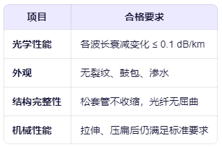 - 光学测试:衰减变化 ≤ 0.1 dB/km 为合格